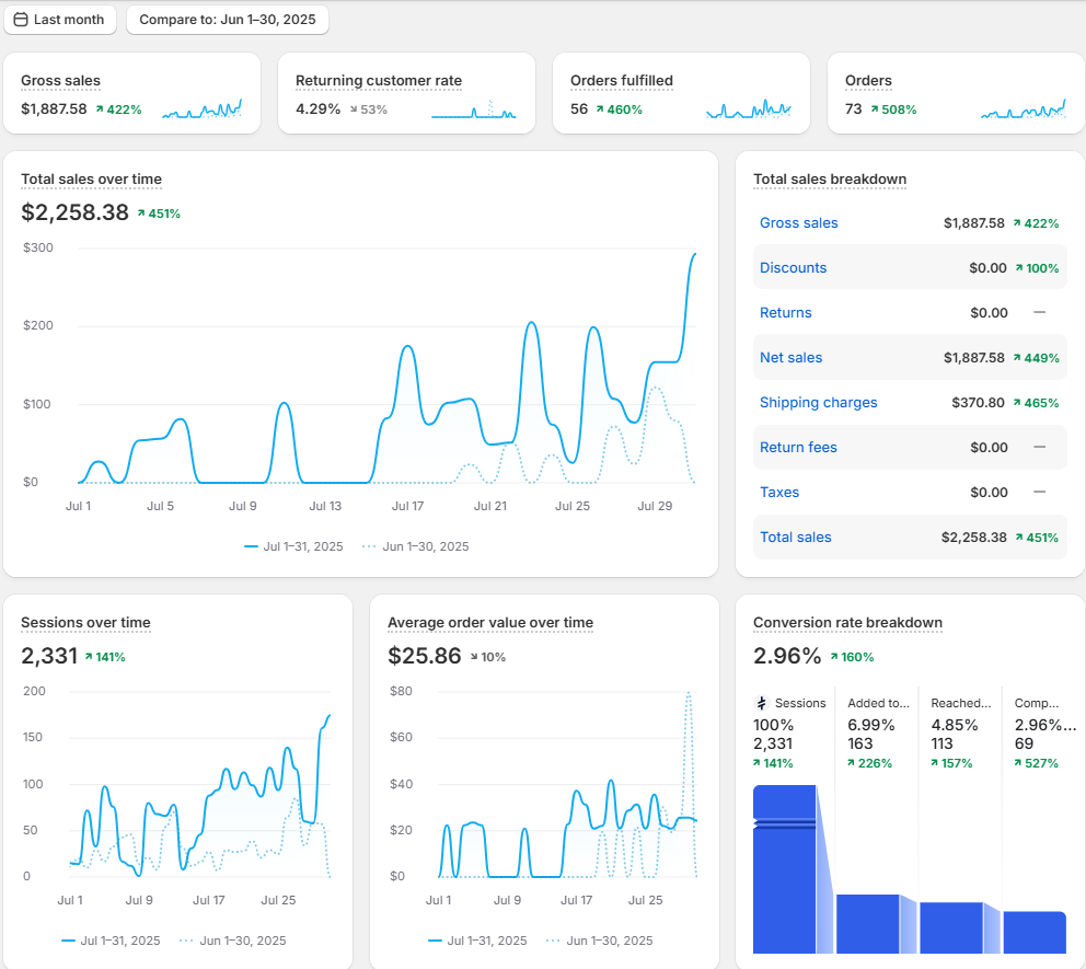 “July was incredible for us — sales grew by 451% compared to June! We had 2,331 site sessions and hit a 2.96% conversion rate. The improvements in marketing and customer targeting clearly worked.”