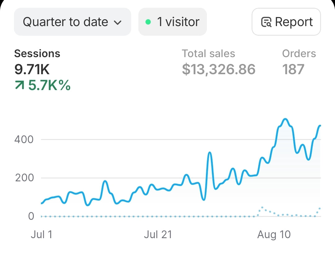 “Since partnering with the team, our online store has seen amazing growth — 9.7K sessions and over $13,000 in sales this quarter. We’re finally seeing steady traffic and consistent orders. Their strategy made all the difference.”
