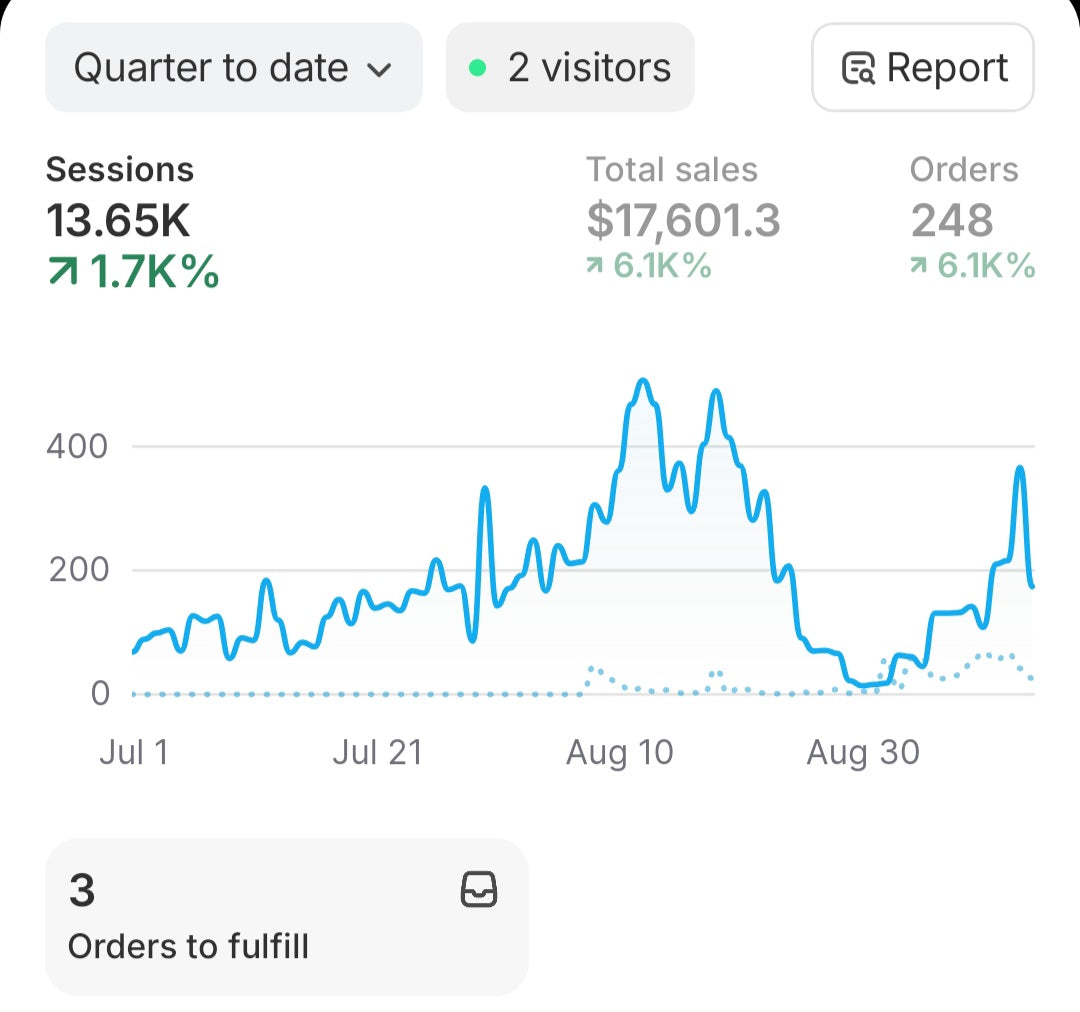 “Our total sales jumped to $17,601 with 248 orders this quarter — and over 13.6K sessions on the site! These results prove that consistent optimization and smart ad spend truly pay off. Couldn’t be happier with the direction we’re heading.”